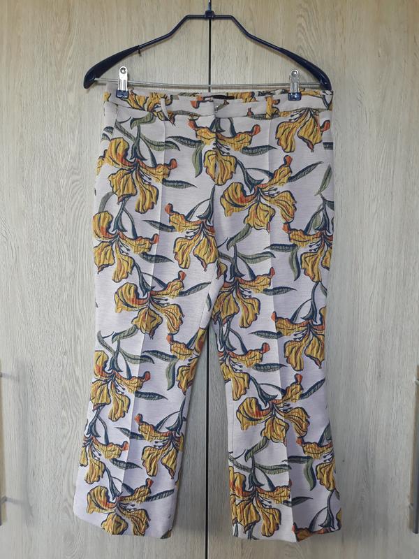 Укороченные брюки.Размер 10.Длина 83,ПОТ 40,ПОБ 52.Полиэстер, котон,эластан. Нюанс есть зацепки, на такой ткани почти не видно