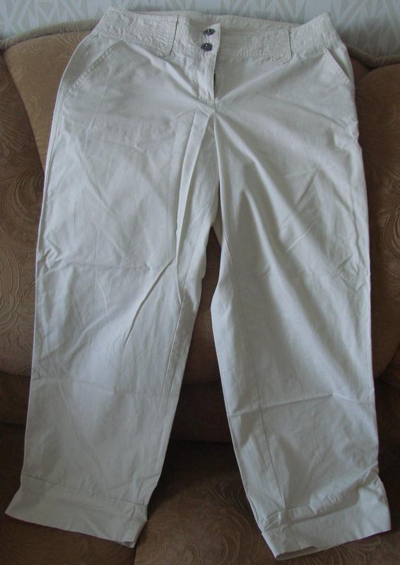 Капрі S. Oliver. Розмір 36. 100% cotton. В ідеальному стані. Пів обхват талії (зі spini) - 36 див. Пів обхват стегон - 46 див Довжина від верху до низу (збоку) - 86 див. Довжина від паху до низу - 65 див Довжина від пояса до матні (ззаду, по середньому шву) - 30 див Довжина від пояса до матні (спереду) - 25 см. Ширина штанини зверху (від матні) - 28 см. Ширина штанини знизу - 21 див.
