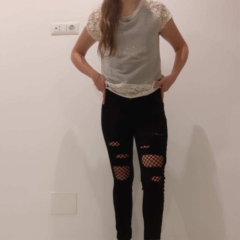 Штани чорні з дирками,що прикриваються сіточкою.Виглядає дуже круто