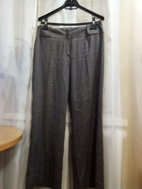 колір коричнево-сірий, в дрібну смужку, розмір 38, составшерсть, полиэсьерн ,еластан, заміри: талія 43, довжина 96 ,стегна 50, ширина штанини 26, покроковий перед 26,зад 36
