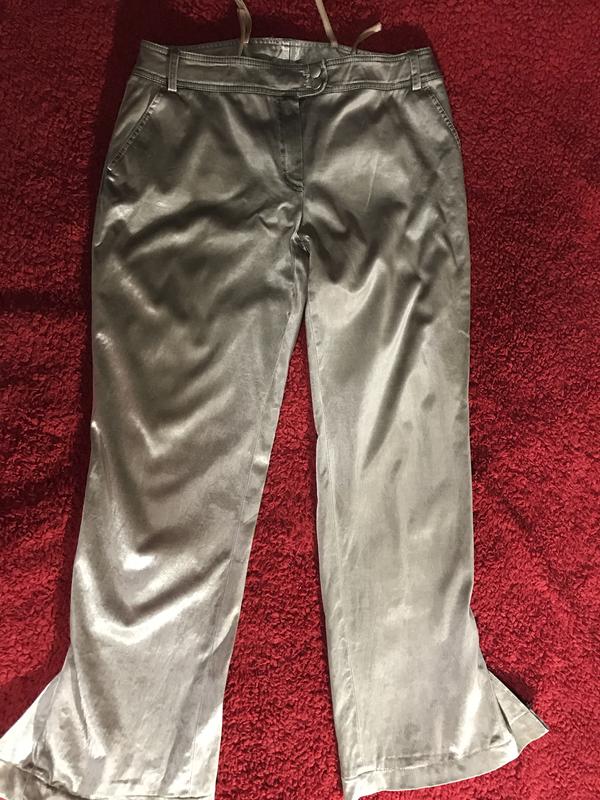 Брюки необыкновенного цвета(пудровая карамель)с ,,отливом’’,внизу с разрезами клёш.48% cotton;47% viscose;5% elastane.Длина 99 см;п.о талии 40 см;высота посадки 32 см;п.о ширины бёдер 57 см;п.о. Ширины брючин 31 см;ширина клёша 52 см.