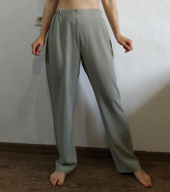 Штани шифонові сірі прямі Талія на резинці Талія від 36 см до 40 тягнеться Стегна 54-55 см Посадка 35 см загальна Довжина 103 см Ширина штанини внизу 21.3 см Від перехрестя швів низу довжина 75 см На фото моделі завеликі(стегна 94 см, зріст 166)