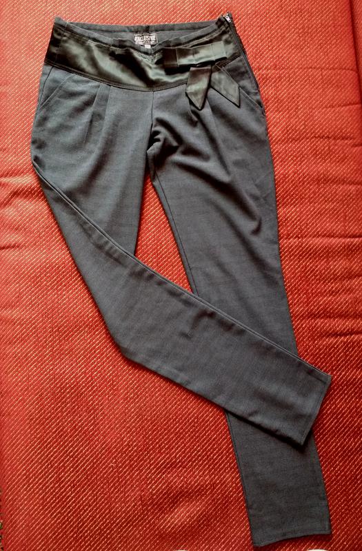 Стильні штани,класичні прямі. Якість тканини відмінне з пришитим поясом з атласу. З 2ма кишенями. Розмір s-m. Ідеальний стан, без дефектів. Підлозі обхват талії 39 см, підлозі обхват стегон 46 см. Довжина по зовнішньому шву 102 см, по внутрішньому шву 82 див. Відмінно сидять на тілі.Темно сірого кольору.