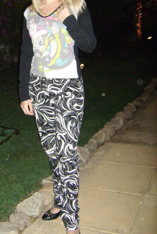Штани легкі, літні, у чудовому стані, не мнуться. Розмір маленький євро 38, наш 42-44 (S). Виробництво Туреччина. Дефектів немає. Заміри: ширина в поясі 37,5 см ширина в стегнах 50 см довжина бічного шва 99 см, відпускається ще на 4 см (є запас, були підшиті) ширина холоші в найширшій частині 28 см ширина холоші в найвужчій частині внизу 17 см посадка середня. Склад: котон 96%, еластан 4%