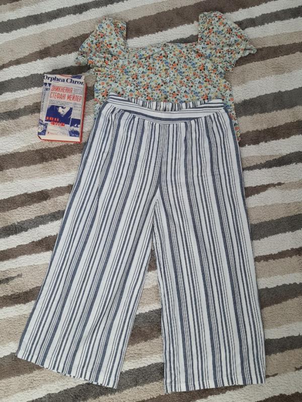Вашій увазі пропонуються класні і якісні жіночі кюлоти укорочені широкі штанці ззаду на поясі резиночка легкі різні смужки колір білий з блакитними смужками те, що потрібно для літа Розмір вказаний 14 або 10 або M-L М повна дивіться виміри