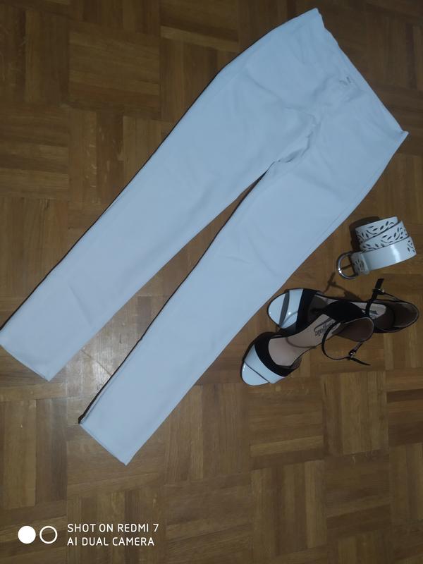 Білі літні штани.Тоненький котон. Маленький розмір на дуже худеньку дівчину.Довжина 91см, ПОТ 34см,ПОБ 36см.Тканина трохи тягнеться.Стан дуже хороший,одягалися декілька разів.