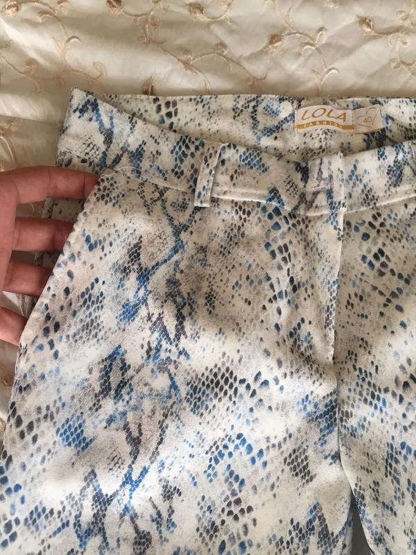 Брюки класичного крою,з помірно високою посадкою ,дещо тягнуться,тканина за типом костюмноі ,гарно тримають форму ,зміїний принт ,є у варіанті чорних з сірим малюнком та білі з голубим,розмір 40