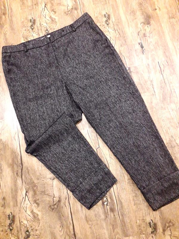 Шикарні брючки, дуже стильно виглядають. Тканина практично немнется, нитка трохи блищить. Низ підвернутий, пристрочен, тканина дуже приємна. піт 51-52. побіди 61. посадка 36/46. довжина 99 див. Стан нової речі.