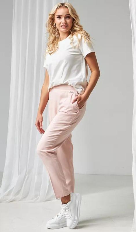 базові брюкинаиоіто пудрового кольору( ніжний рожевий з легки бежевим підтоном) з якісного фактурного матеріалу 100% модифікований поліестер, приємний до тіла, не мнеться, модель вільного крою з защипами спереду, ззаді на резинці, є бічні кишені, штанини на широкій резинці внизу, комфортна посадка. Талія ПО 36( макс 48), стегна ПО 52, посадка 28-33, довжина по боковому шву 97, по внутрішньому 70 відмінно сидять на будь-якій фігурі, вказаний розмір 10(38), підійде на М,орієнтуватися по замірах