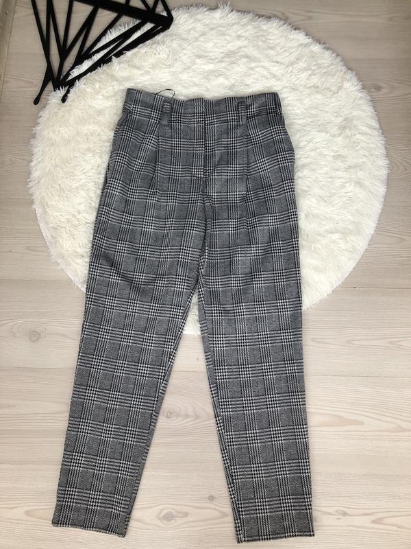 Стильные брюки Принт гусиная лапка Высочайшая посадка На талии сзади вставка резинка Плотная ткань ,приятная к телу Есть лямки для ремня Есть карманы Идеальное состояние Замеры П.о.т-36 Высота посадки-34 П.о.б-48 Длина-97 Внутренний шов-64 Ширина низа-16