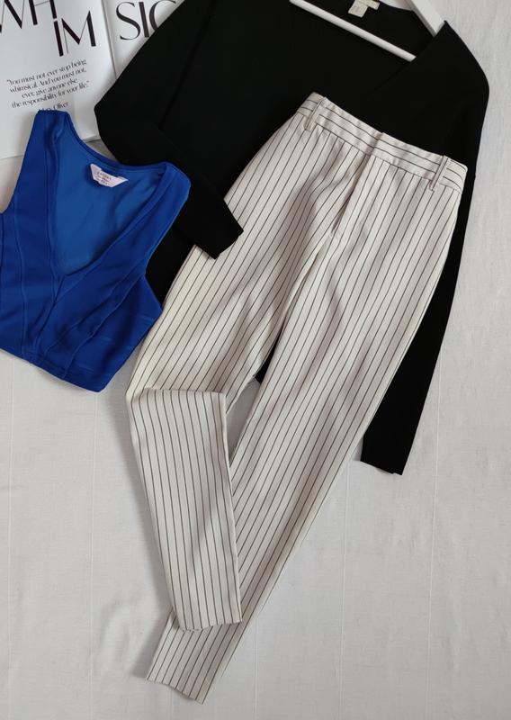 Молочні брюки в полоску від Avant Premier з боковими кишенями, завужені до низу, тканина цупка, розмір вказано 34, ширина поясу 36 см, ПО бедер 47 см, довжина 89 см