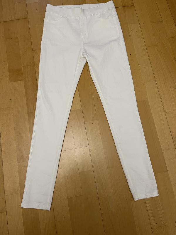 Брюки эластичные белого цвета. Карманы впереди и сзади, фасон имитирует джинсы. Без застежки. Пояс 39 см, тянется до 48 см. ПОБ 45 см, тянется до 56 см. Длина 104 см, ширина 13 см.