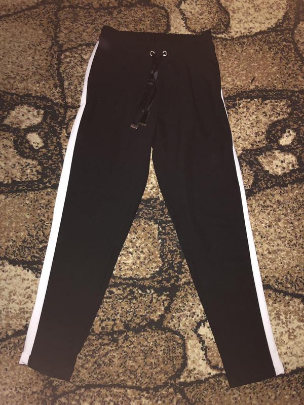 жіночі чорні штани з білими лампасами по боках.на талії попереду шнурок а ззаду резинка. є кишені .