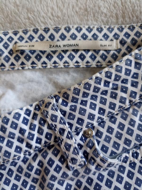 Летние джинсы, Ткань котон 83%, полиестер 15%, пластин 2%. Цвет:белые в синий ромбик. Размер 42-44 ПОТ 35-40тянется, ПОБ 42,, длина 95 см Посадка 21 см спереди. Состояние новых.