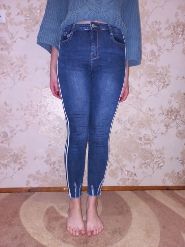 Розмір S На бедра до 90 см На талію до 65 см Тканина стрейч Темно-синього кольору з двома білими полосками Внизу потертості
