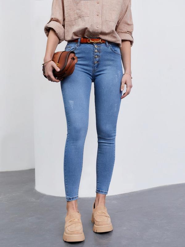 Укорочені джинси-скінні із потертостями. Модель із стандартною посадкою. Застібаються на гудзики за планкою. Позаду розташовані накладні кишені. Пасок в комплект не входить. 📍Артикул: 90266 👗Розміри: 38, 40, 42, 44, 46, 48, 50