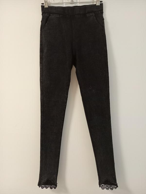 Джинси стрейч. У талії на гумці, без застібок. Кишені спереду та ззаду. По низу оздоблення мереживом. Посадка висока. Колір сіро-чорний,морний. Розмір вказаний M-L, по факту йдуть на XS-S-M, точніше за замірами, джинс пружний стрейч і ще тягнеться: довжина 97/73 НОТ 30,тягнеться до 46 НОС 36,5,тягнеться до 50 НО вгорі ноги 22, тягнуться до 30 ПЗ в коліні 15, тягнуться до 21 ПЗ внизу 11,тягнуться до 14. Склад: бирок із складом немає, імовірно, бавовна/еластан — джинс пружний, середньої щільності, грубші тонкий, підійде на весну-літо або теплу осінь. Стан дуже гарний, але є невеликий брак варенки на одній нозі вгорі — останнє фото та все фото загалом, в іншому чудові джинси за скромною ціною. Висилаю після повної оплати. Автоматичні замовлення приймаються. Також у мене в продажу є гарний вибір джинсів/штани різних моделей і розмірів за доступними цінами — заходьте поцікавитися й придбати.
