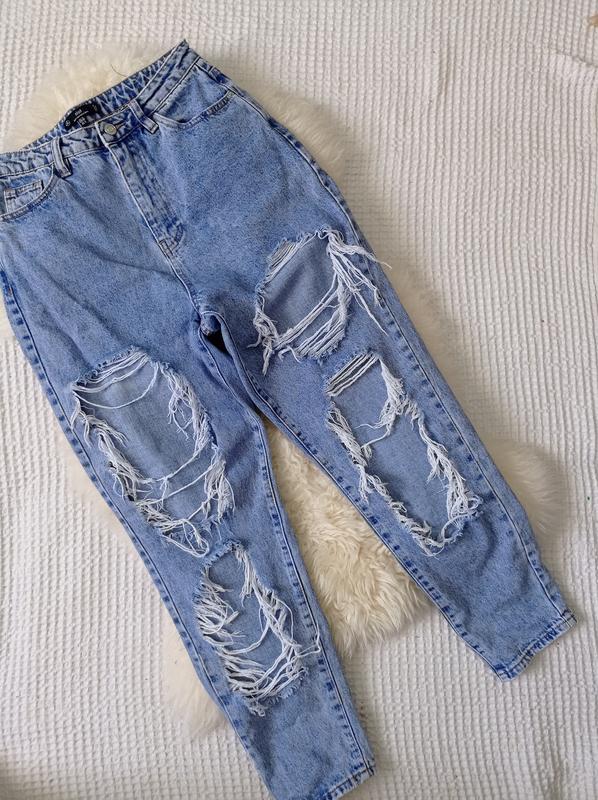 Джинси рвані, тканина не тягнеться В дуже хорошому стані,є ньюанс маленьке пятно,мало замітне(фото),в ціні враховано Розмір вказаний 8 Заміри на фото,не тягнеться