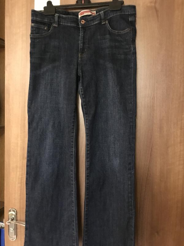 Джинси жіночі, розширені до низу. Тканина цупка, трохи є стрейча.Посадка висока Довжина 104 см Крок 78 см Напівобхват талії 42 см Напівобхват стегон 48 см Ширина штанини: Зверху 24 см Знизу 26 см