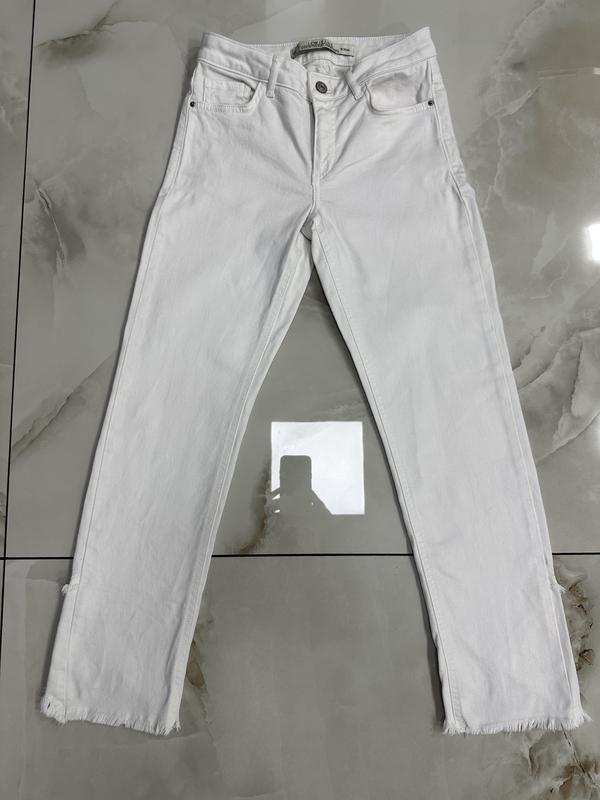 Білосніжні джинси з гарним низом. Стан ідеальний. Розмір 34. Заміри: довжина 89 см, крок 64 см, посадка 23 см, піт 32 см, б 42 см, ширина штанини внизу 16,5 см. Тканина трохи тягнеться.
