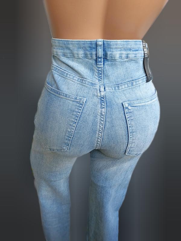 Дуже стильні джинси. М'які, приємні на дотик, еластичні, гарно лякають по тілу, мають високу посадку і правильний крій. Попереду кишені обманки. Колір трішки відрізняється від фото. Країна виробник Бангладеш Тканина 79% котон, 20% поліестер, 1% еластан. Розмір 46 (170) Довжина виробу від талії до низу штанів 104 см Довжина шагового шва 76 см Полуобхват талії 36 см тягнеться до 43 см Полуобхват стегон 40 см