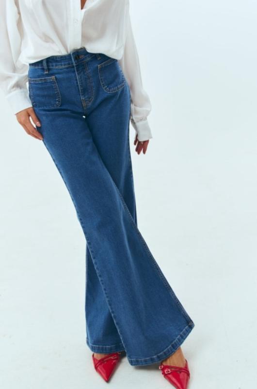 Джинси кльош від бедра. Десь на 42-44р. Тонкі, на літо. Класно сидять.