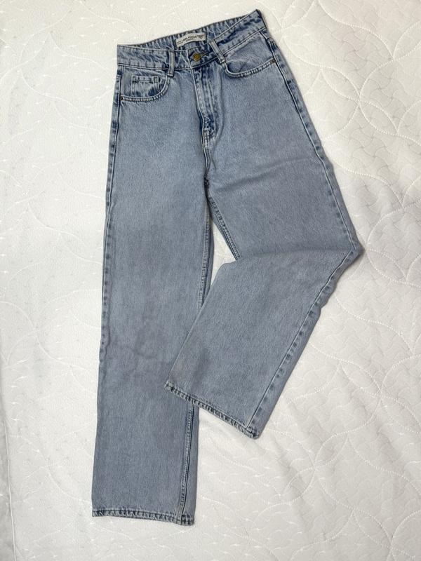 Жіночі джинси палаццо. Щільний якісний денім, не тягнеться. Колір — класичний синій. Посадка — висока. Виробництво — Туреччина. Застібка — блискавка і ґудзик. Стан — відмінний. Розмір: S Мірки: • довжина (по зовнішньому шву) — 104 см • довжина (по внутрішньому шву) — 76 см • пояс (напівобхват) — 33 см • стегна (напівобхват) — 49 см
