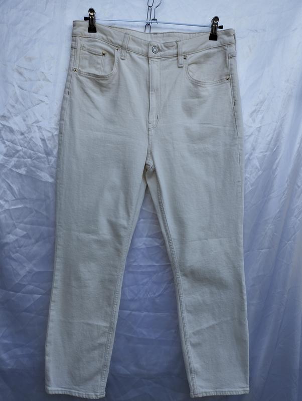 Напів о.т.- 44 напів о.с.- 54 посадка - 31/42 напів о.стегна- 30 напів об низу-17 довжина він.шву- 67,5 довжина - 97 Тканина - щільна, зміст тканини відрізано, відсутністє. Котон, еластан. Крій звуження до низу. Дівчата при замірах виявлено ньюанс плямки(фото) надаю ,товар не прала, може відійдуть цяточки.