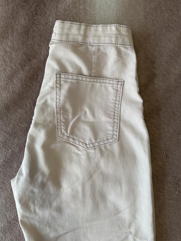 Розмір - 36 (S) НОТ - 32 (висока посадка) НОБ - 45 Довжина - 93 Довжина від талії по шву ззаду - 32 Біля щиколотки - 12 Джинс тягнеться. Без дефектів. Стан хороший. Молнія працює. Колір світлий, майже білий, але підтон і нитки лілові (фото не до кінця передає колір).