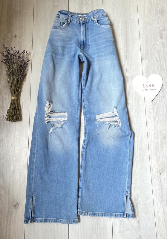 Прямі широкі брюки Forever 21 з високою посадкою рвані Довжина по боковому шву 104 см Довжина по внутрішньому шву 80 см НОТ 37х2 (тягнуться до 41,5х2) НОС 55 (тягнуться до 65х2) Посадка 30/35 см Ширина штанини зверху 32х2 см(тягнеться до 37х2) Ширина штанини знизу 24 см Висота розрізу 10 см