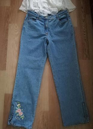 Легкі джинси 7/8,внизу з боків блискавки, на правій штанині красива вишивка, розмір 38,піт 37,поб47(+тягнеться), довжина 93,посадка спереду 24,ззаду 39,за штанини внизу 19.