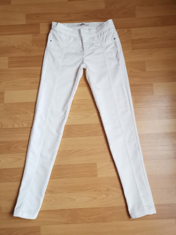 Білі стрейчеві скіні, дуже добре тягнуться, м'які і красиво обтягує По талії 36см По стегнах 42см Висота посадки спереду 21см Висота посадки ззаду 27см Довжина по зовн.шву 96см Довжина по внут.шву 76см