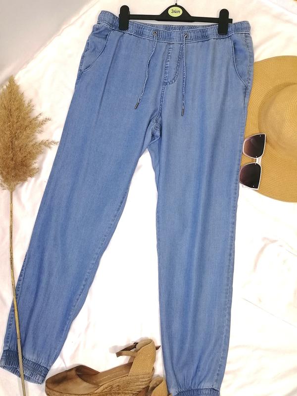 Жіночі джинси джогери, літні. Тонкі, легкі, на шнурку. Дуже зручні. Глибока Посадка. Розмір - L- XL, наш -50 -52 100% - ліосел Заміри: Довжина виробу -100 ПОТ -45 ПОБ -57 Шир штанини верх -29см Шир резинки низ - 14см Посадка перед -30см Посадка зад - 40см Ширина штанини - це полуобхват. Повний Обхват 29+29=58 Штани типу шаровари Оплата на карт. Доставка за рахунок покупця Нова пошта або Укр пошта. Стан ідеальний, як нові. Легка дихаюча тканина, тонша за котон. Сідає по фігурі, за рахунок шнурків затягується по розміру. Перш ніж зробити замовлення уточнюйте наявність. Усі деталі краще обговорити завчасно.