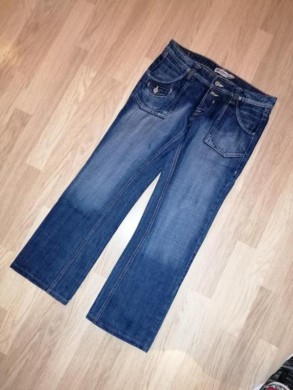 Джинси прямі, щільні, стан ідеальний. 100% коттон, не тягнуться. різнобарвна прострочка. Плям немає, на фото більш темний джинс. Дуже гарний колір. Заміри: Довжина - 76/95см Пояс обхват - 86 см Низ брючины обхват - 42 см Середній передній шов - 22 см Задній середній шов - 35 см