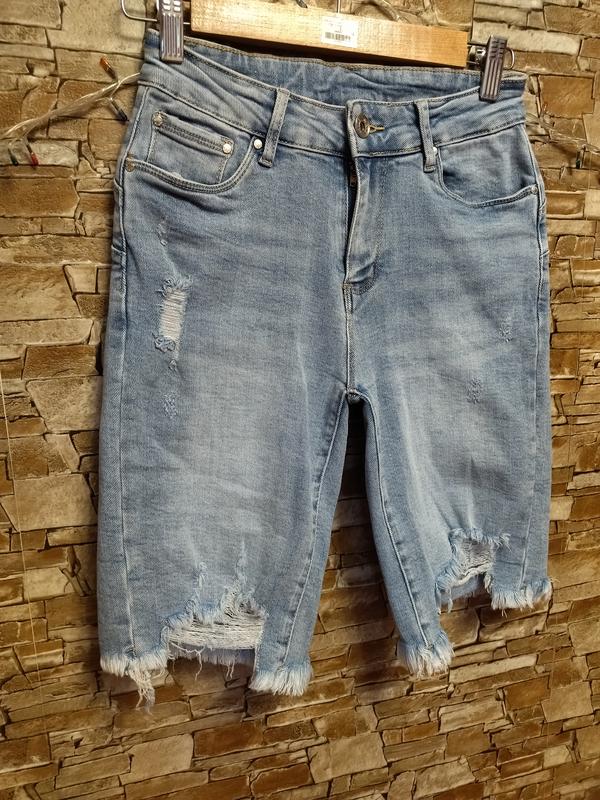 Круті,брендові джинсові шорти,фабричні рваності та потертості, блакитного кольору,добре тягнуться, висока посадка, щільні, ідеально сидять на фігурі, стройнить,стан нових. Європейський розмір вказано-36 орієнтуйтеся на заміри: довжина -49см,пояс-32-33, тягнеться до -38см,поб-42-43, тягнеться до -49см, посадка -24,5/36см, напівобхват штанини зверху -24,5+тягнуться. Дивіться також інші мої оголошення!