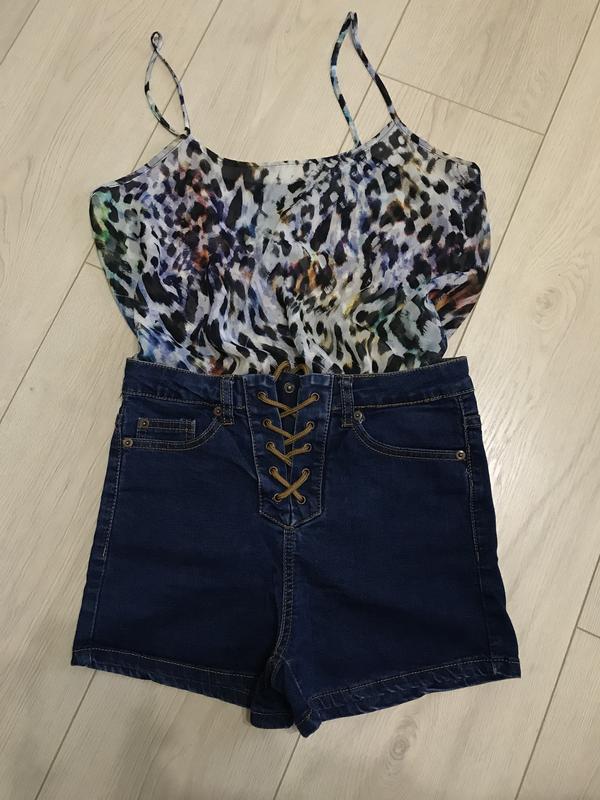 Джинсові стрейч-шорти FBsister з високою посадкою. Топ TopShop, легкий, об’ємний, з комфортної тканини. Заміри шортів: Довжина - 32 см Ширина в талії - 33 см (півобхват) Ширина в бедрах - 38 см (півобхват) Заміри топ: Довжина - 36 см Ширина в грудях - 44 см (півобхват) Ширина - 54 см Можна придбати речі окремо)