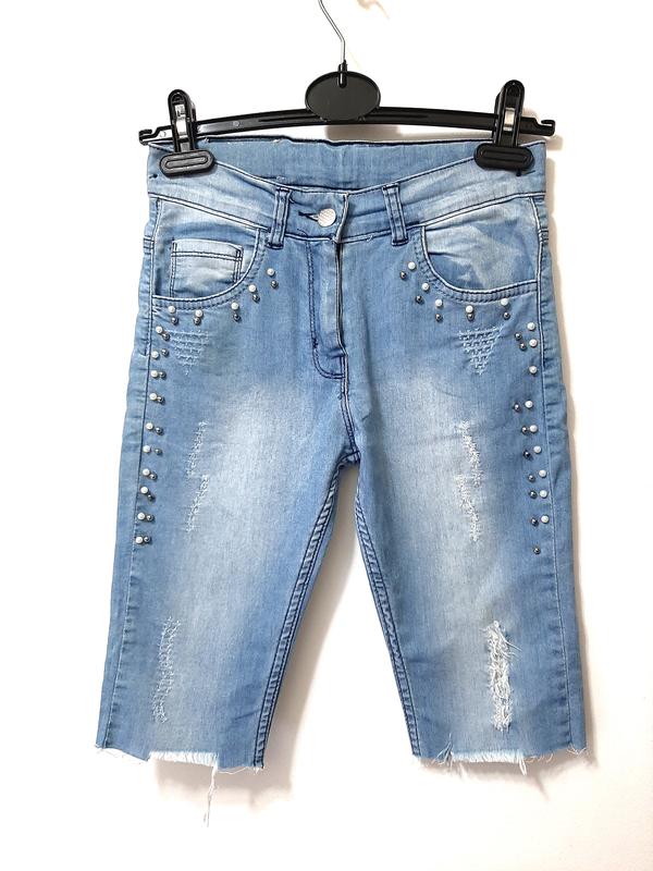 Джинсові шорти подовжені сині літні дряпані декор намистини жіночі 31 44 46