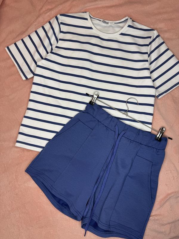 Футболка в смужку вдягнула 2 рази Шорти нові Костюм в розмірі s Пояс на резинці ( добре тягнеться) Функціонуючі кишені. Тканина якісна 2х нитка( добре видно на 3 фото) приємні на дотик