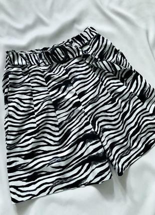 Шорти в зебровий принт, з тонкої, щільної тканини ( 100% бавовна), в ідеально-новому стані, без дефектів. По бокам кишені, ззаду в поясі гумка. Довжина 44 см, Нот. + - 34 см, Нос. 54 см, Ширина штанини внизу 31 см.