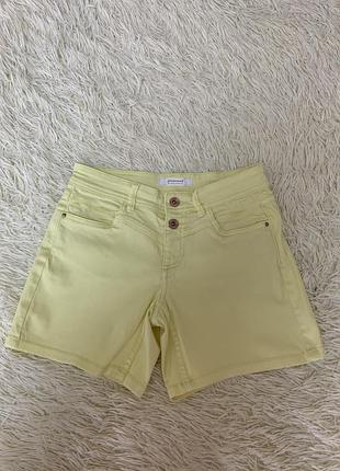 Джинсові шорти приємного лимонного кольору, застібаються на маленьку блискавку та два ґудзики, спереду дві кишені та дві накладні кишені ззаду, ідуть на розмір XS-S, заміри пів окружність поясу 34 см, пів окружність бедер 48 см, довжина 33 см
