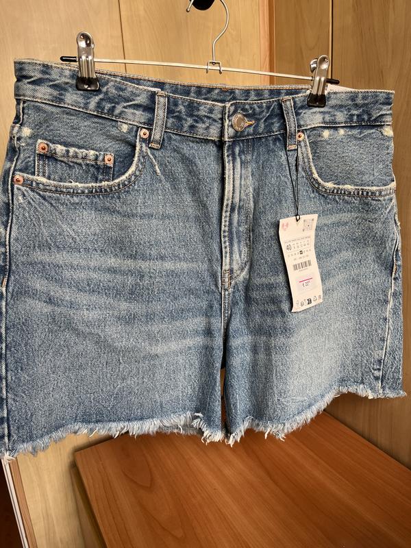 Продаю АБСОЛЮТНО НОВІ жіночі шорти Zara блакитного кольору (розмір EU 40). ПРОДАЮ ДЕШЕВШЕ, НІЖ КУПИЛА. * Середня посадка * П'ять кишень і шлевки для ременя * Застібка-блискавка + металевий ґудзик * Необроблені нижні кромки * Склад: 100% бавовна (дихає і комфортний у спеку) 📏 Параметри: * Талія - 85 см * Стегна - 101 см * Довжина - 40,5 см * Висота крокового шва: спереду 29,5 см; ззаду 36 см Шорти куплені в Zara, але, на жаль, розмір не підійшов. Якщо потрібно, можу надіслати додаткові фото🍃