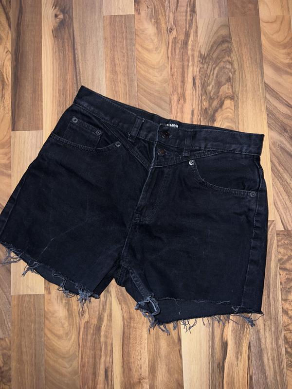 Джинсові шорти чорного кольору від бренду Pull&Bear, ідеальний варіант для літніх прогулянок Без дефектів, не носилися жодного разу Розмір на бірці вказаний 38/М, але на С також добре сядуть. Напівобʼєм таліі — 38 см Напівобʼєм стегон — 50 см Висока посадка