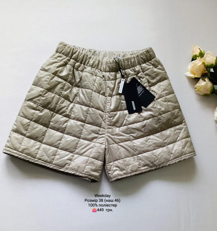 Шорти демі від Weekday. Розмір 38 (наш 46). Склад: верх 100% поліестер, підкладка 100 % поліестер, наповнювач 100% поліестер. Заміри: довжина по бічному/внутрішньому шву 42/11 см, ПОТ 36 см резинка тягнеться до 46 см, ПОБ 55 см, висота посадки переда/спинки 33/37 см, ширина штанини в паху 36 см. Стан новий з бірками.