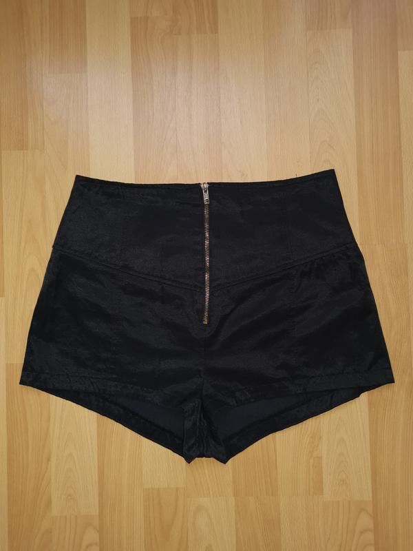 Шорти чорні з щільної тканини з високою посадкою на замочку, дивіться заміри По талії 36см По стегнах 48см Висота посадки спереду 32,ззаду 38см Обхват ноги 31см