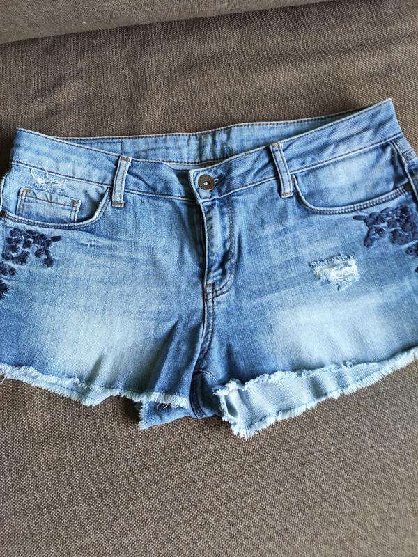 Продам новые джинсовые шорты Colin's, размер EU38, UA44, обхват талии 70-74, обхват бедер 94-98. Шорты на пуговице с молнией. Спереди два прорезных кармана, сзади два накладных, вышивка.