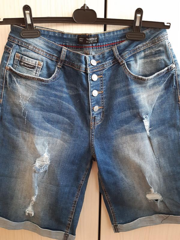 Дуже класнючие,зручні,стрейчеві шортики!абсолютно нові!джинс середньої щільності і тягнеться,якість просто шикарне 95%бавовна та 5% спандекс.розмір 34,але краще орієнтуйтеся по замірах:напівобхват талії 39-46,обхват стегон 114-118,ширина штанини в паху 30см,ширина по низу штанини 26см.довжина 57см.