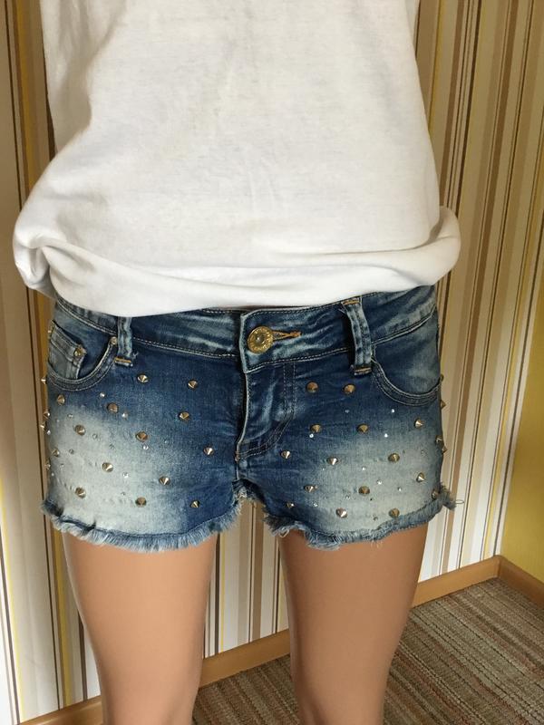 Літні короткі шорти, розмір S. Декор металевими клепками. Тягнеться. Заміри: піт 39 см, Побіди 46 см, довжина 23 див.