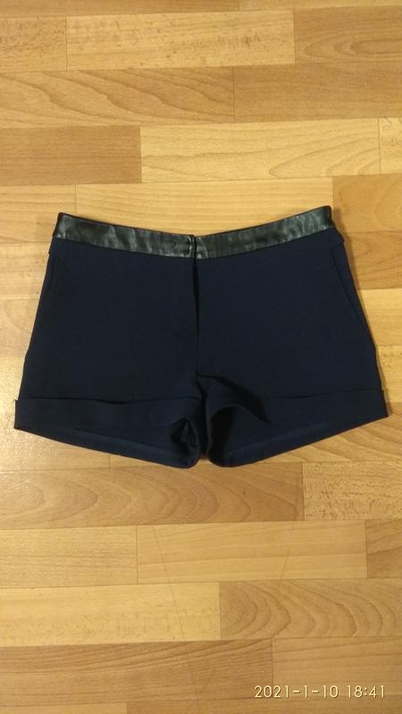 Шорти в ідеальному стані, темно-синій колір. Довжина 27см, талія 34см, стегна 42см, трохи тягнуться. Посадка середня. Без дефектів.