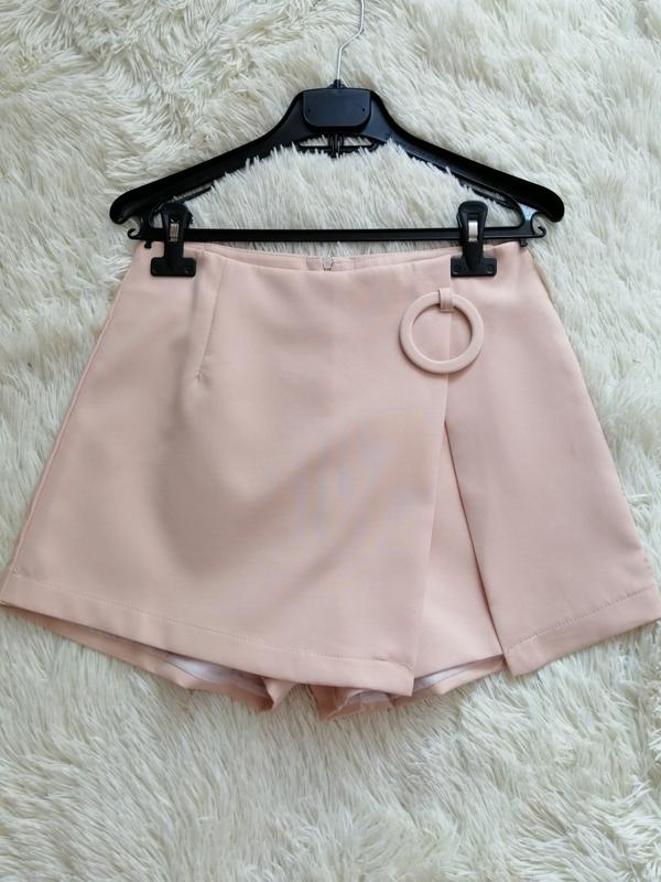 шорти-спідниця з ефектом запаху декоративним кільцем колір ніжний персик розмір на бірці L ,але сяде на s-m бирок зі складом тканини немає, тканина костюмка на підкладці , заміри*** піт 37 см побіди 53 см посадка спереду 35,5 см ззаду 40 см довжина по боковому шву 35 см , допускаю похибка у вимірюваннях +-1 см