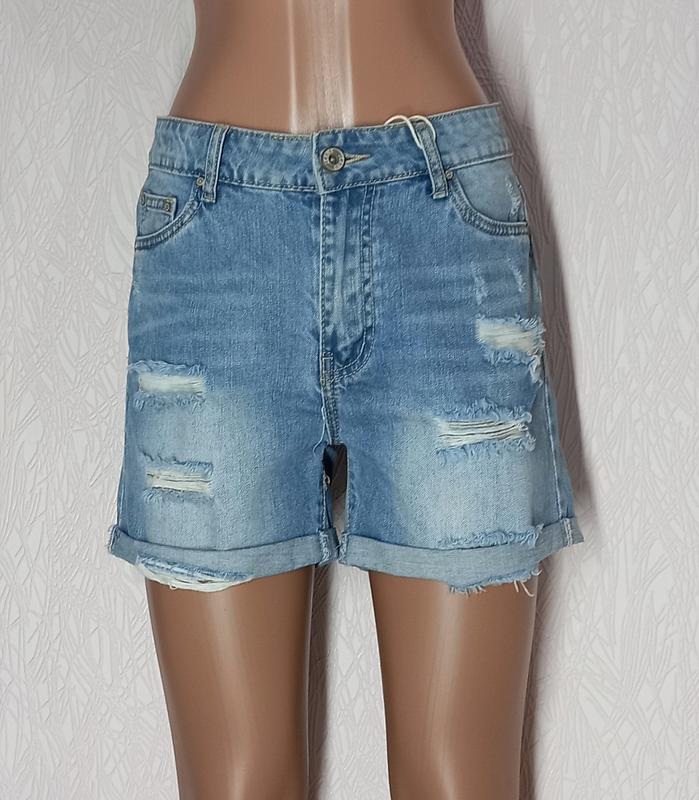 Джинсові моложежные рвані шорти з підворотом. З боків і ззаду є кишені. Колір світлий блакитний. Виробництво Китай. Фото реальні. Розмір: 28 Заміри: Довжина: 35 см Висота посадки: 26 см Половина об'єму талії: 38 см Половина об'єму стегон: 48 див. Дивіться і інші цікаві моделі в моїх товари. Приємних покупок!